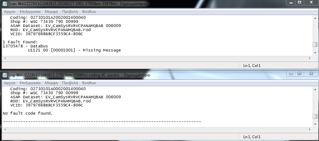 Code:Saturday,24,February,2024,12:43:05:38567 VCDS -- Windows Based VAG/VAS Emulator Running on Windows 10 x64 VCDS Version: 23.11.0.0 (x64) Data version: 20231027 DS351.0 www.Ross-Tech.com Dealer/Shop Name: Local Dealer Workshop Code: 790 73430 000999 VIN: WAUZZZ8V1G1043815 License Plate: Mileage: 57921km-35990mi Repair Order: coding 6C success -------------------------------------------------------------------------------- -------------------------------------------------------------------------------- Chassis Type: 8V-AU37 (5Q0) Scan: 01 02 03 05 08 09 10 13 14 15 16 17 19 22 2B 42 44 52 55 5F 6C A5 A9 BB BC VIN: WAUZZZ8V1G1043815 Mileage: 57921km-35990miles 01-Engine -- Status: OK 0000 02-Auto Trans -- Status: OK 0000 03-ABS Brakes -- Status: OK 0000 05-Acc/Start Auth. -- Status: OK 0000 08-Auto HVAC -- Status: OK 0000 09-Cent. Elect. -- Status: OK 0000 10-Park/Steer Assist -- Status: OK 0000 13-Auto Dist. Reg -- Status: OK 0000 14-Susp. Elect. -- Status: OK 0000 15-Airbags -- Status: OK 0000 16-Steering wheel -- Status: OK 0000 17-Instruments -- Status: OK 0000 19-CAN Gateway -- Status: OK 0000 22-AWD -- Status: OK 0000 2B-Steer. Col. Lock -- Status: OK 0000 42-Door Elect, Driver -- Status: OK 0000 44-Steering Assist -- Status: OK 0000 52-Door Elect, Pass. -- Status: OK 0000 55-Headlight Range -- Status: OK 0000 5F-Information Electr. -- Status: OK 0000 6C-Back-up Cam. -- Status: OK 0000 A5-Frt Sens. Drv. Assist -- Status: OK 0000 A9-Struct. Borne Sound -- Status: OK 0000 BB-Door Rear Drv -- Status: OK 0000 BC-Door Rear Pass -- Status: OK 0000 ------------------------------------------------------------------------------- Address 01: Engine (J623-CJXC) Labels:. 06K-907-425-V1.clb Part No SW: 8V0 906 259 F HW: 06K 907 425 B Component: 2.0l R4 TFSI H13 0002 Revision: --H13--- CVN: AD8DD0AA Coding: 0A1D00122466010B3004 Shop #: WSC 06385 790 00016 ASAM Dataset: EV_ECM20TFS0208V0906259F 001004 ROD: EV_ECM20TFS0205G0906259J.rod VCID: 43851480CA037F899E-8016 VINID: 9D196AAAA2260570401032011415C1C9FB No fault code found. Readiness: 0000 0000 ------------------------------------------------------------------------------- Address 02: Auto Trans (J743) Labels: 0D9-927-770.clb Part No SW: 0D9 300 012 HW: 02E 927 770 AQ Component: DQ250-6A MQB H53 4912 Revision: 06253104 Serial number: TFK01508290443 CVN: 00007ACF Coding: 0014 Shop #: WSC 04742 780 00200 ASAM Dataset: EV_TCMDQ250021 001001 ROD: EV_TCMDQ250021.rod VCID: 53A524C03A63EF092E-8006 No fault code found. ------------------------------------------------------------------------------- Address 03: ABS Brakes (J104) Labels: 5Q0-907-379-IPB-V1.clb Part No SW: 3Q0 907 379 AB HW: 3Q0 907 379 G Component: ESC H42 0723 Revision: 00000000 Serial number: 62425000000291 Coding: 31F16BA254242A6F017F070141C8698CD62A5480E08296F6184150F48208 Shop #: WSC 06385 790 00016 ASAM Dataset: EV_Brake1UDSContiMK100IPB 034036 ROD: EV_Brake1UDSContiMK100IPB_034.rod VCID: 7AFBA964FD49FE418D-802E No fault code found. ------------------------------------------------------------------------------- Address 05: Acc/Start Auth. (J518) Labels:| 5Q0-959-435.clb Part No SW: 5Q0 959 435 A HW: 5Q0 959 435 Component: VWKESSYMQB 021 0604 Revision: 00021000 Serial number: 0380112412 Dataset Number: 8V0909577C 0009 Coding: 030C0C Shop #: WSC 00000 000 00000 ASAM Dataset: EV_KessyHellaMQBAB 002011 ROD: EV_KessyHellaMQBAB_002.rod VCID: 3A7B6964BDC93E41CD-806E No fault code found. ------------------------------------------------------------------------------- Address 08: Auto HVAC (E87) Labels:| 8V0-820-043.clb Part No SW: 8V0 820 043 D HW: 8V0 820 043 D Component: AC Automat H14 0060 Revision: 20028000 Serial number: 00000000738246 Coding: 03000004000000011000000000001100 Shop #: WSC 06385 790 00016 ASAM Dataset: EV_AirCondiFrontVaAU37X 008020 ROD: EV_AirCondiFrontVaAU37X_008.rod VCID: 336544409AA3CF090E-8066 Humidity sensor: exterior: Subsystem 1 - Part No SW: 4H0 907 658 HW: 4H0 907 658 Component: AQ_Hum_Sensor H03 0003 Serial number: 111988C7000000000001 No fault code found. ------------------------------------------------------------------------------- Address 09: Cent. Elect. (J519) Labels:| 5Q0-937-08X-HV1.clb Part No SW: 5Q0 937 084 AS HW: 5Q0 937 084 AN Component: BCM MQBAB H H24 0175 Serial number: 01061526401121 Dataset Number: 8V0909514M 0091 Coding: 04051D46C24106FD03804004B11807A80800000000000000000000000000 Shop #: WSC 06385 790 00016 ASAM Dataset: EV_BCMMQB 015001 ROD: EV_BCMBOSCH_015.rod VCID: 0919C6A8A8AFE5D994-805C Wiper motor control module: Subsystem 1 - Part No SW: 8V1 955 119 C HW: 8V1 955 119 A Labels: 5QX-955-119-V1.CLB Component: WWS371 150803 042 0585 Serial number: 150904042631 Coding: 0A47F7 Rain/Light Recognition Sensor: Subsystem 2 - Part No SW: 8U0 955 559 C HW: 8U0 955 559 B Labels: 8U0-955-559.CLB Component: G397_RLFS H06 0004 Serial number: 20641493 Coding: 00006C Light switch: Subsystem 3 - Part No SW: 8V0 941 531 AA HW: 8V0 941 531 AA Component: E1 - LDS MQB H05 0032 Serial number: 09 07 2015 00001805 Anti-theft alarm system sensor: Subsystem 4 - Part No SW: 8V0 951 177 HW: 5Q0 951 172 Component: Sensor, DWA 005 0316 Serial number: 000000000ZY152170U9L Alarm horn: Subsystem 5 - Part No SW: 5Q0 951 605 HW: 5Q0 951 605 Component: Sirene, DWA 004 0311 Serial number: 00000000000033468396 No fault code found. ------------------------------------------------------------------------------- Address 10: Park/Steer Assist (J446) Labels:| 5Q0-919-294.clb Part No SW: 5Q0 919 294 K HW: 5Q0 919 294 A Component: PARKHILFE 8K H03 0054 Revision: -------- Serial number: 39331526105103 Dataset Number: 8V0909526E 0042 Coding: 0070150011 Shop #: WSC 73430 790 00999 ASAM Dataset: EV_EPHVA18AU3700000 002026 ROD: EV_EPHVA18AU3700000_VW26.rod VCID: 43851480CA037F899E-8016 No fault code found. ------------------------------------------------------------------------------- Address 13: Auto Dist. Reg (J428) Labels:| 5Q0-907-567.clb Part No SW: 5Q0 907 567 P HW: 5Q0 907 567 